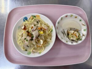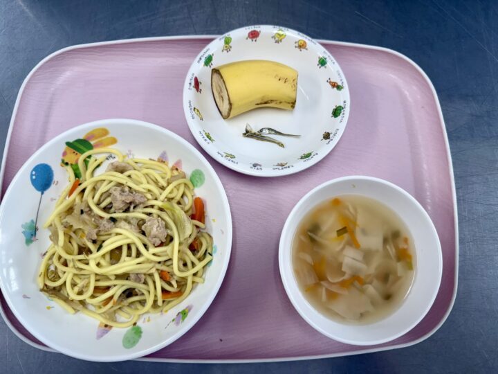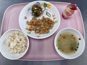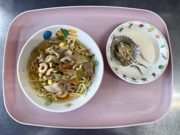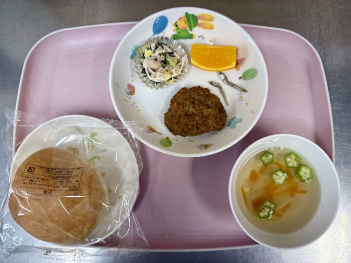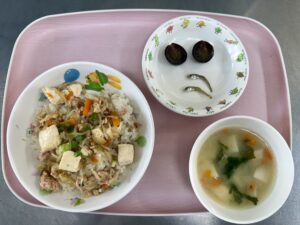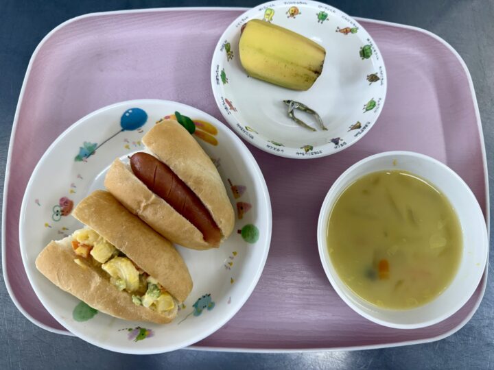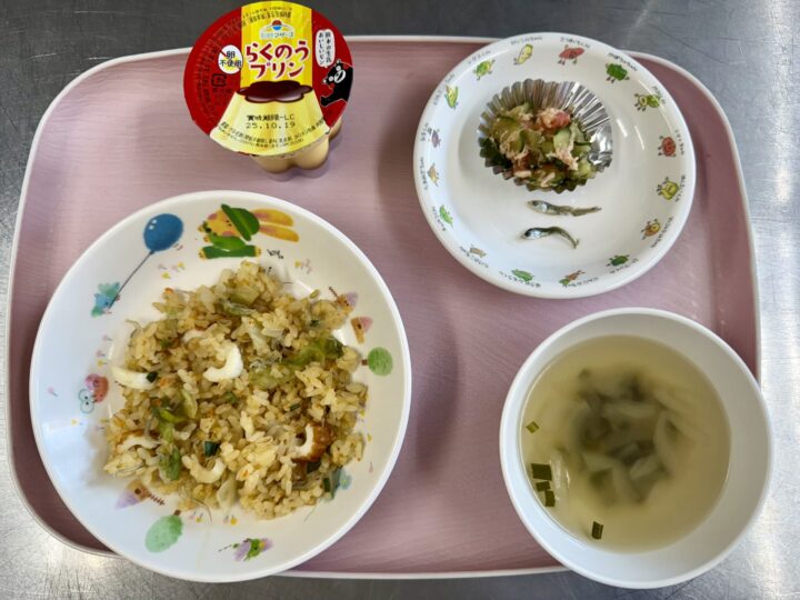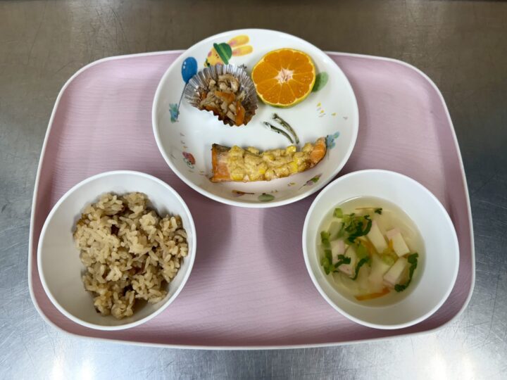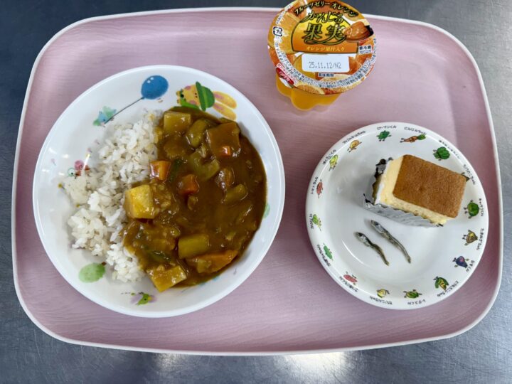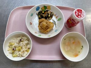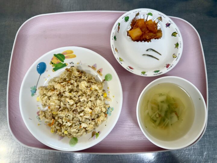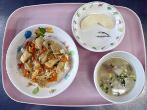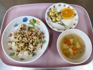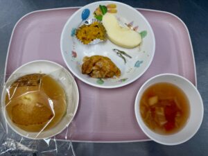 タンドリーチキン かぼちゃサラダ ミネストローネ りんご、いりこ |