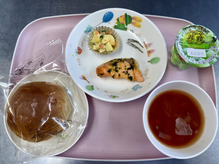 ブロッコリーとチーズのサラダ ジョア(ブルーベリー味)、いりこ |